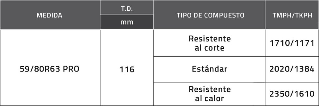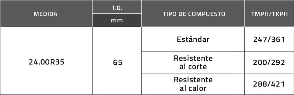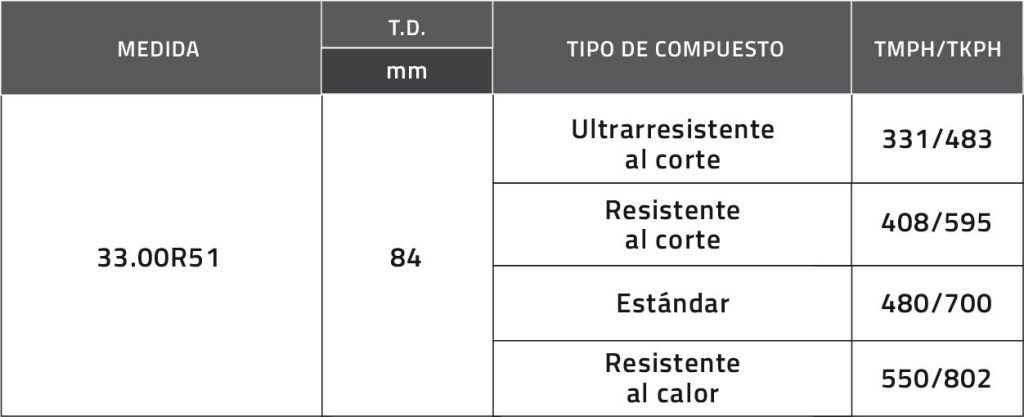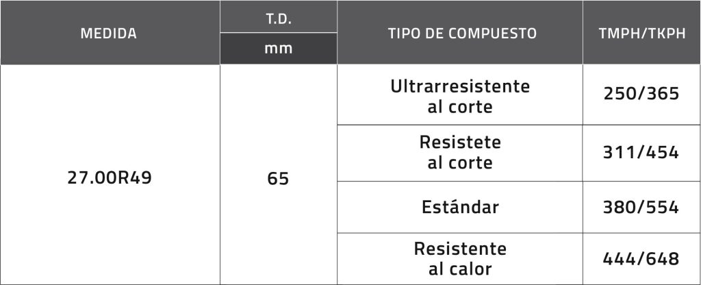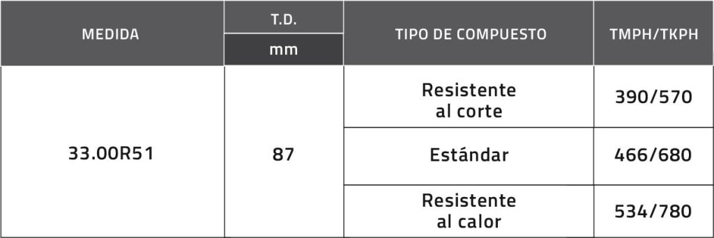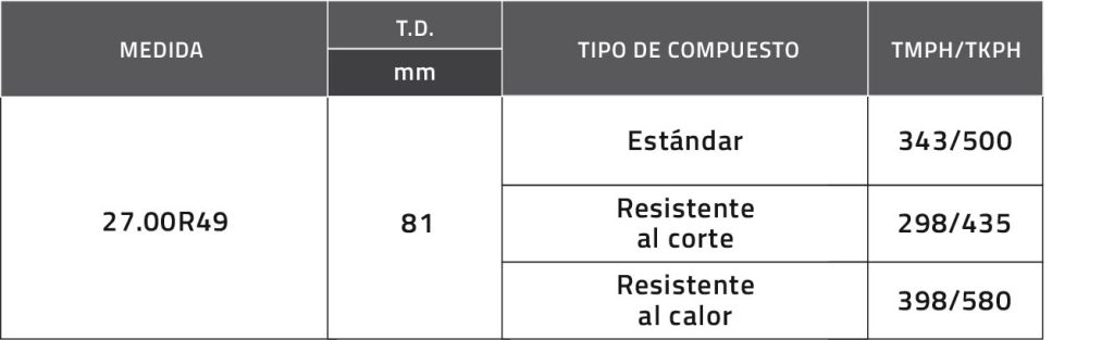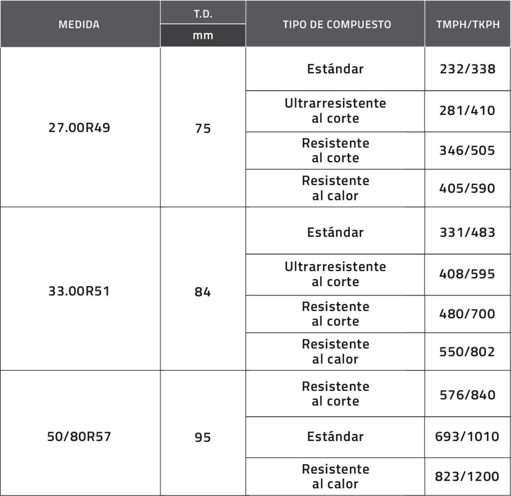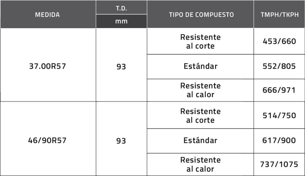 - La base de la banda de rodadura resistente al calor reduce la temperatura del Neumático aumentando el limite de TKPH/TMPH.