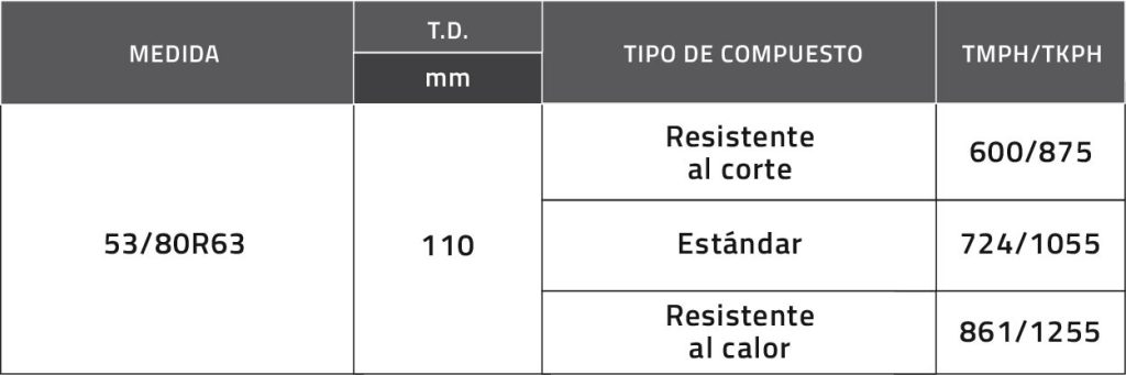 - La gran profundidad de la banda de rodadura proporciona una vida útil más prolongada y asegurando un menor costo operativo por hora.
